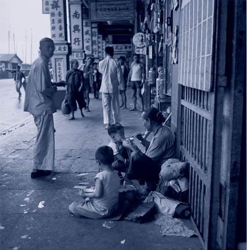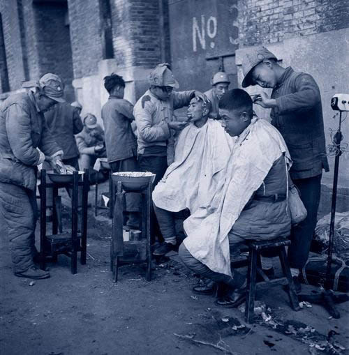 从“满洲”撤退下来的士兵在黄浦路边的理发摊子上理发。(1948年10月,上海)