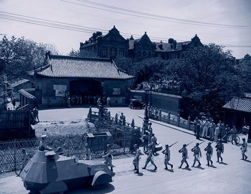 这是为阻止交通大学的学生去参加****而出动的士兵和装甲车。(1948年6月,上海)