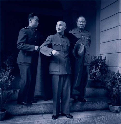 一位副官正为蒋介石“总裁”护持大衣。蒋刚刚结束了与傅作义将军就“保卫”北平的计划所进行的会谈。(1948年10月,北平)