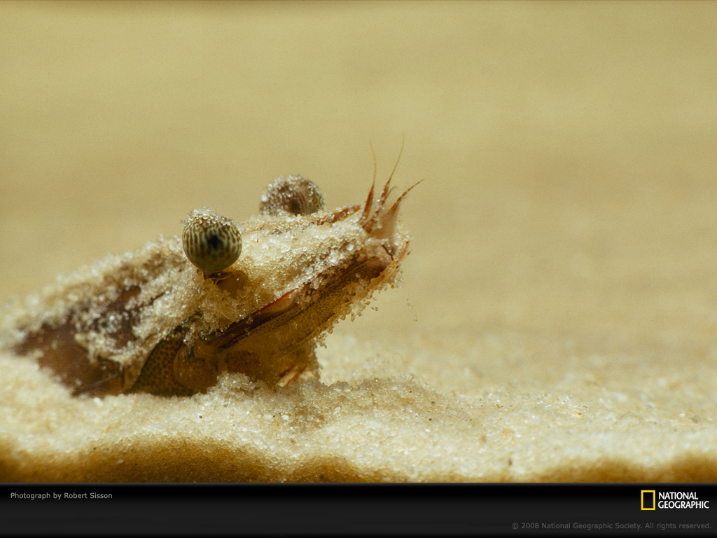 为躲避光照,一只粉色的虾把自己埋在水族馆的沙中,只露出触须和高尔夫球似的眼睛。为了躲避猎食者,他们会将自己埋藏得更深,只留下一个供呼吸的小孔。