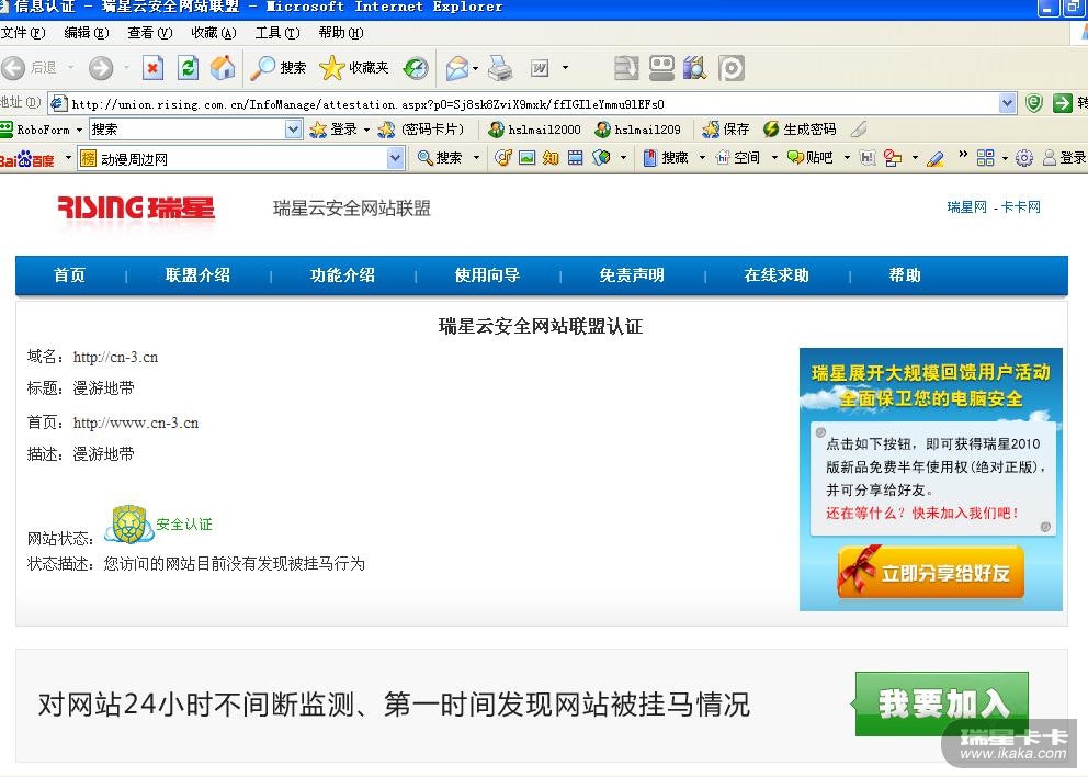 求助,已经加入瑞星云,显示安全认证,怎么瑞星还报毒 site.ikaka也显示毒挂马~~~