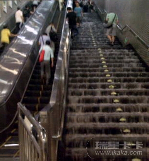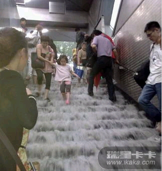 6月23日,在北京地铁4号线陶然亭站内,人们在被雨水冲刷的台阶上行走。
