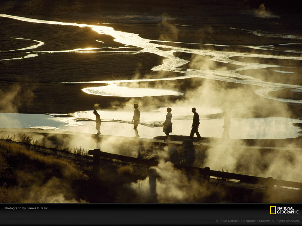 这里是怀俄明州黄石国家公园的诺里斯间歇泉盆地(Norris Geyser Basin),几个徒步旅行者正从温泉和蒸汽口之间穿过。诺里斯间歇泉盆地是公园最热的地方,它的名字来源于公园以前的一位负责人。