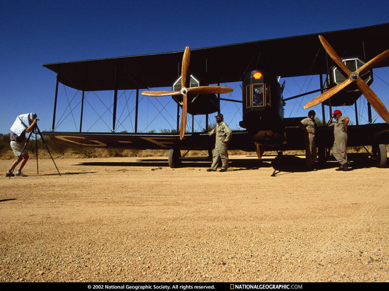 这是一架双发动机和双翼飞机的复制图片,驾驶员的座舱是开放的,当第一次世界大战时作为轰炸机。在1919年澳大利亚人驾驶同样的飞机第一次从澳大利亚直飞英国。