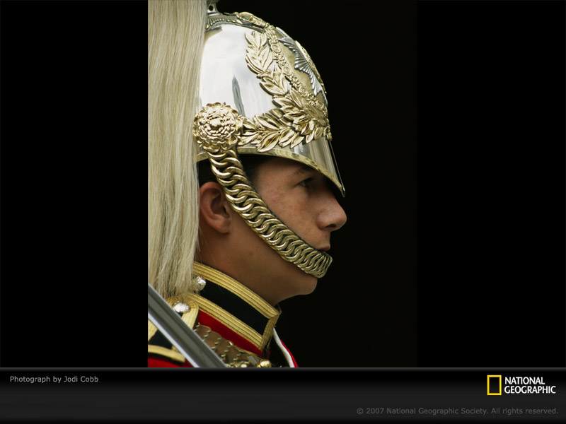 摄影师使用远距离照相技术而获得一幅肖像,卫兵站立在伦敦白金汉宫。图片的背景是暗色但是清洁,使得头盔真正的突出在画面上。