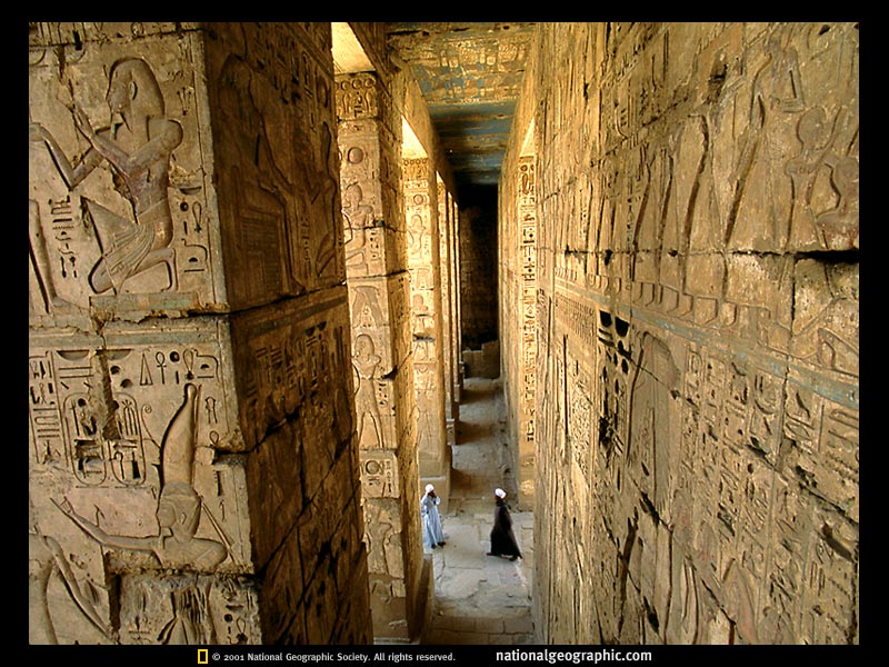 寺庙,埃及,1999年。这所庙宇是用来停放死人的庙,人们都关注埃及的神灵,城堡位于尼罗河的西岸,庙宇里面看到许多的象形文字是描写战役的,埃及人和对利比亚人的入侵者叫做:海洋人。古老的埃及人们的笔迹是一种神圣的礼品来自(Thoth)--描写神化的上帝,不可思议的用宗教迷信方式给别人治病的人,有智慧的封建地主和学者的资助。