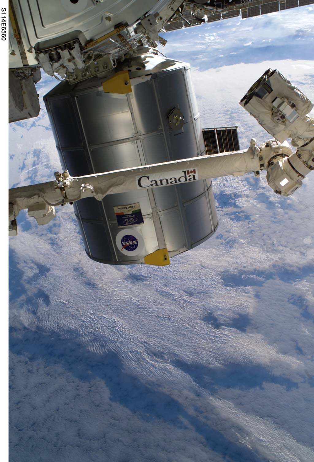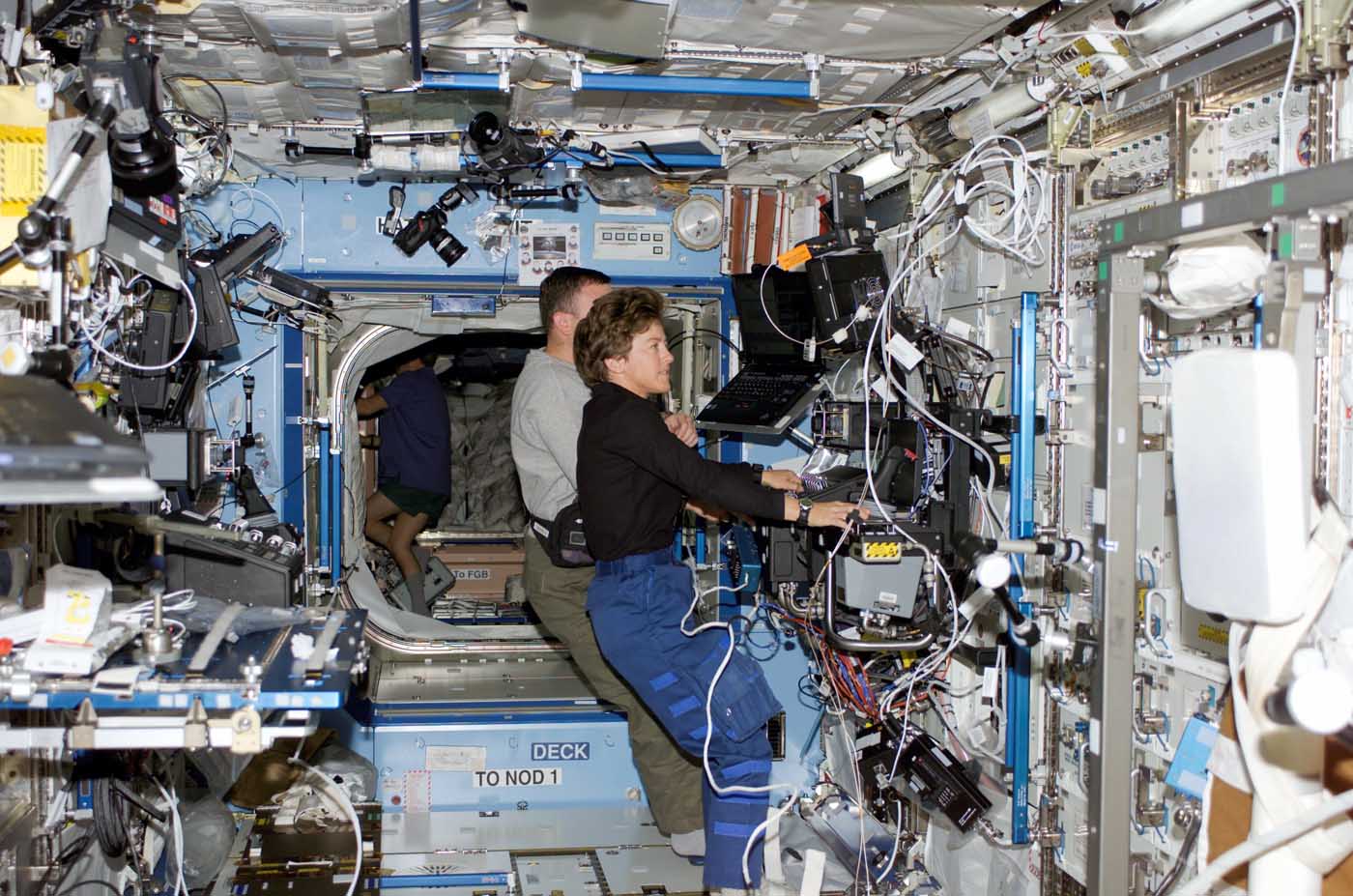 2005年7月31日,宇航员温迪·B·劳伦斯与詹姆斯·M·凯利在宿命号太空舱里操纵外面的遥控系统和机器人手臂。