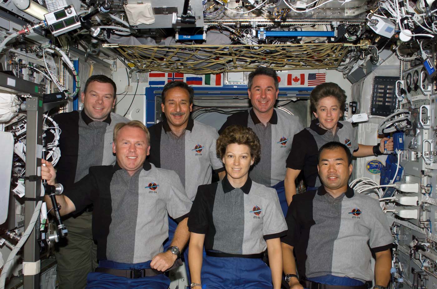 2005年8月2日,发现号的7名宇航员在国际空间站美国的宿命号太空舱里。