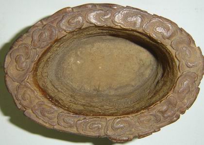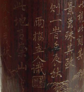 图10 高14.5公分 直径9公分, 清中晚期,器口竹节环绕,器座雕勾莲纹,中心画面一面雕狮子滚绣球,一面雕曲折回环的方胜格,两侧铭文“真事业从五伦做起,大文章是六经得来。”雕方胜格那面中国民风浓郁,特别雅致。有趣的是狮子的面部雕得恰似一个五角星。作品中规中矩,略显拘谨,作者推断此物属清代某店铺经销的商品。