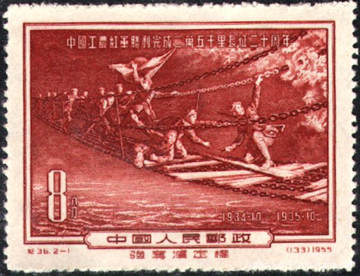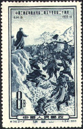 1933年9月,蒋介石调集100万军队向红军发动第五次“围剿”,部署进攻中央根据地的兵力有50万。此时,全国红军虽已发展到30万,红一方面军也发展到近10万人。但是,“左”倾冒险主义者根本否认敌强我弱这个基本事实,完全听从当年9月到中央苏区来的共产国际军事顾问李德的错误主张,使红军遭受重大损失,最后不得不和苏维埃共和国一同退出中央革命根据地,进行战略大转移。1934年10月,中央工农红军8万多人撤离中央根据地,开始了举世闻名的长征。1936年10月,红军一、二、四方面军终于在甘肃会宁、静宁地区胜利会师,至此,全国主力红军的长征宣告结束。为纪念红军长征胜利完成20周年,邮电部发行了这套邮票。以2幅典型画面展示了红军长征的伟大、悲壮和艰苦。