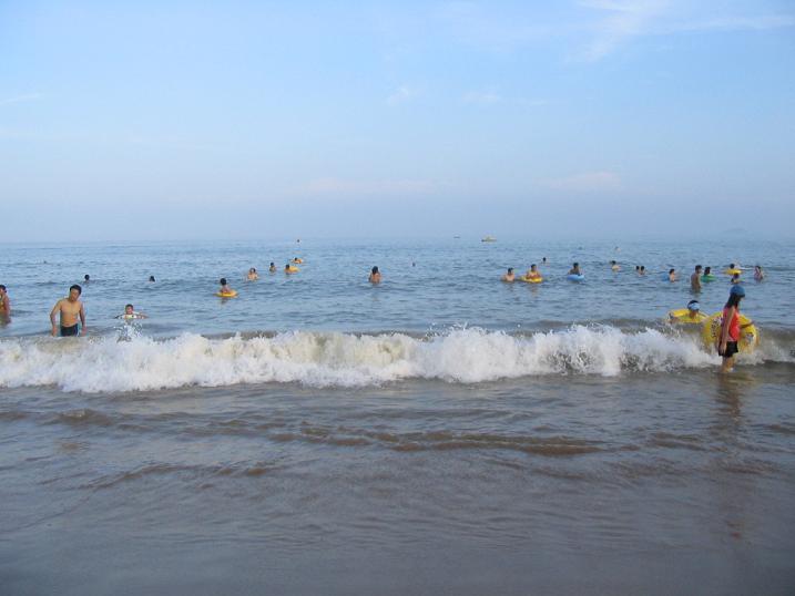 石老人海水浴场,这里人稍微少一些,不像第一海浴那样煮饺子
