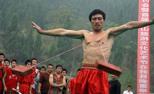 28,在四川省眉山市的旅游节上,这名男子表演用针将两块砖穿在胸前的功夫。