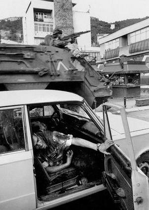 1993年5月,摄影者在波斯尼亚北部一个小镇附近的战场上停留了几个星期。为了扩大他们与塞尔维亚相连部分的土地,塞尔维亚战士越过了穆斯林村庄村民抵抗队伍的防线继续前进。这种深深的仇恨使农民也成为熟练的战斗者。塞尔维亚战士付出了巨大的代价。在代用的停尸室和不断扩展的墓地上,亲戚和朋友们在哀悼死者。在这里,日日处于惊恐中的受害者得以安息。一辆卡车倒下了战斗中死亡的塞尔维亚战士的尸体。第二天,他们将被运回到他们出生的地区。