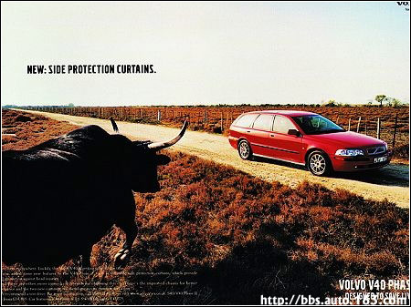 沃尔沃广告。途中车左边的野牛咄咄逼人,蓄势待发,危机就在眼前,可是汽车还是安然自如的行驶着,因为该车“新装了车侧保护装置”。