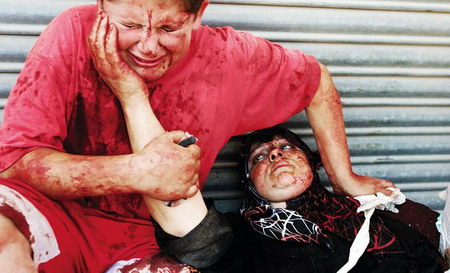 在黎巴嫩南部,一个受伤的男孩在照料受伤的母亲