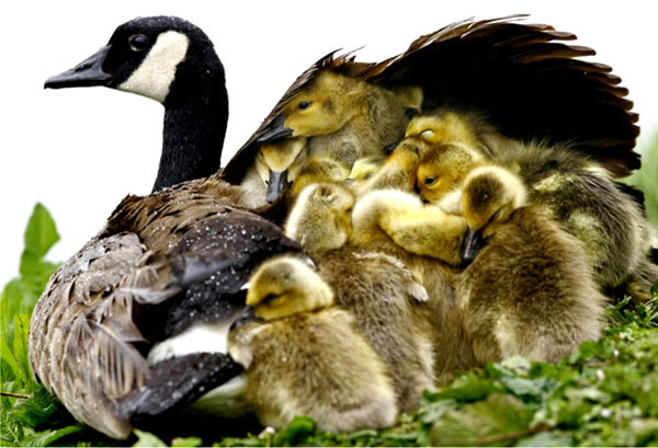 2月23日,雨中,俄勒冈州罗斯伯格的公园里,一只雌鹅用自己的翅膀护住了自己的孩子。 (图片来源:Robin Loznak)