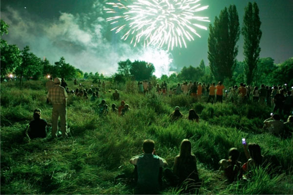 7月5日,罗马尼亚的布加勒斯特,人们在田野中欣赏着礼花的绽放。当天为金色之夜国际火焰节。 (图片来源:路透社)