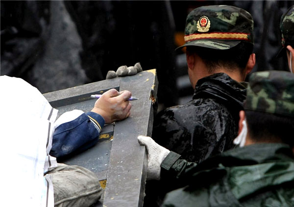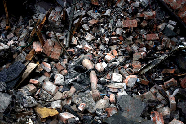 5月13日,四川省都江堰市,瓦砾碎片掩埋了这位地震的遇难者。受5月12日大地震及其余震的影响,总计约有7万人不幸遇难,数百万人失去了自己的家园。(图片来源:美联社)