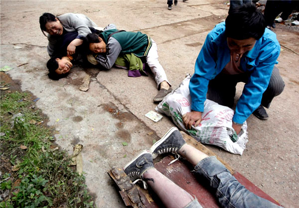 5月14日,四川省绵竹市汉旺镇,一名学生在地震中不幸遇难。他的家人倒地痛哭。在5月12日大地震后,重建灾区是中国面对着的一项严峻的挑战。 (图片来源:路透社)