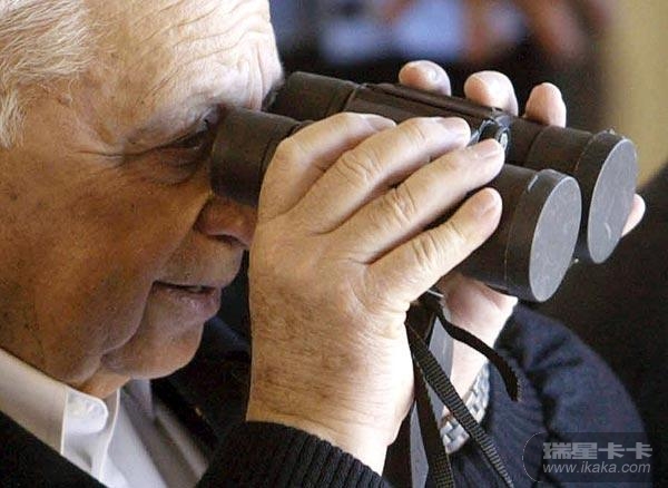 以色列前总理沙龙使用望远镜观看,但很奇怪的是望远镜的镜头还没有打开。
