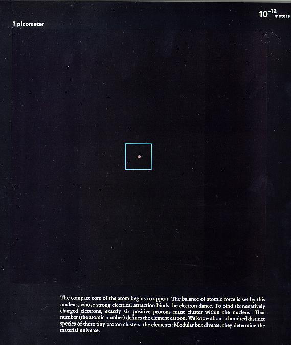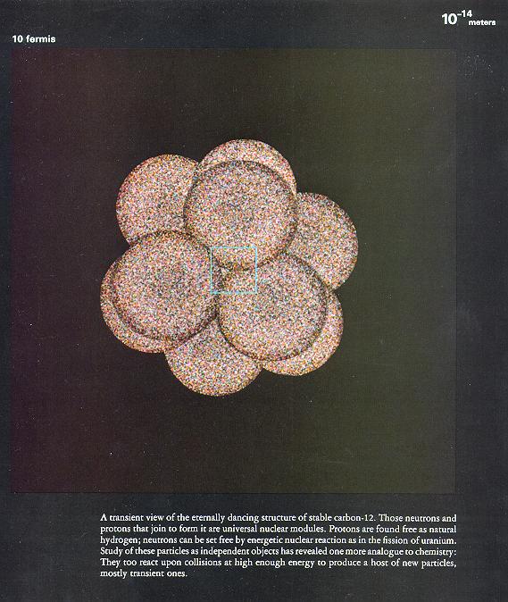 走近点,这就是传说中的原子核了。10的-12次方米叫做一皮米。在0.1皮米的数量级下看原子核就可以看出很多个球球来,它们是带正电的质子和不带电的中子。
