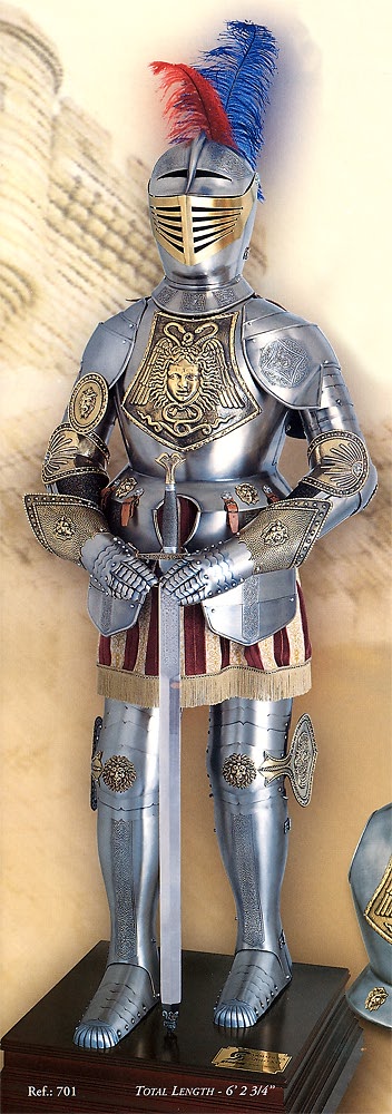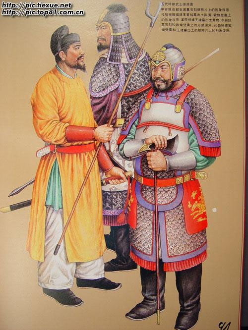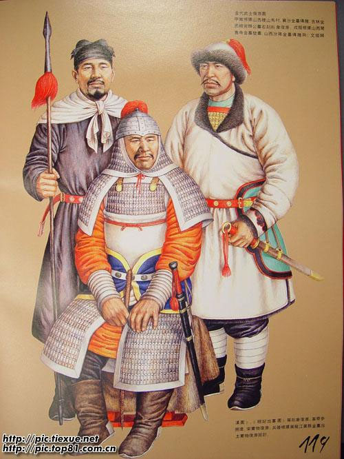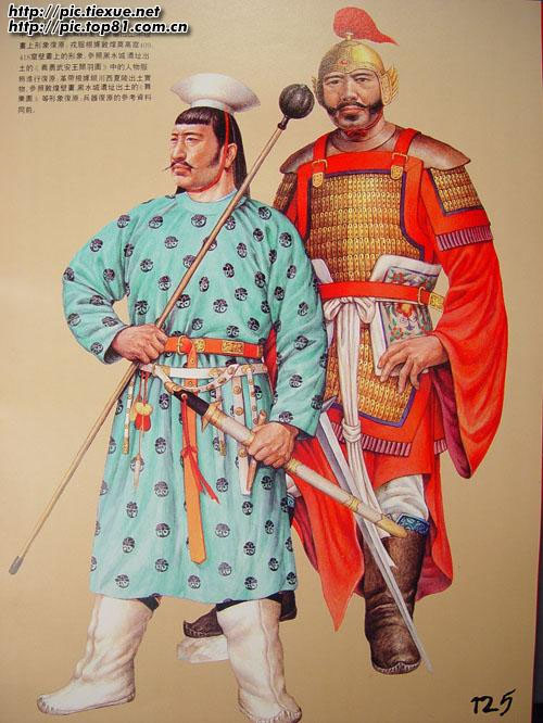 19.清代一般的盔帽,无论是用铁或用皮革制品,都在表面髹漆。盔帽前后左右各有一梁,额前正中突出一块遮眉,其上有舞擎及覆碗,碗上有形似酒盅的盔盘,盔盘中间竖有一根插缨枪、雕翎或獭尾用的铁或铜管。后垂石青等色的丝绸护领,护颈及护耳,上绣有纹样,并缀以铜或铁泡钉。铠甲分甲衣和围裳。甲衣肩上装有护肩,护肩下有护腋;另在胸前和背后个佩一块金属的护心镜,镜下前襟的接缝处另佩一块梯形护腹,名叫“前挡”。腰间左侧佩“左挡”,右侧不佩挡,留作佩弓箭囊等用。围裳分为左、右两幅,穿时用带系于腰间。在两幅围裳之间正中处,覆有质料相同的虎头蔽膝。本图为清代戴盔帽、穿铠甲武士复原图。