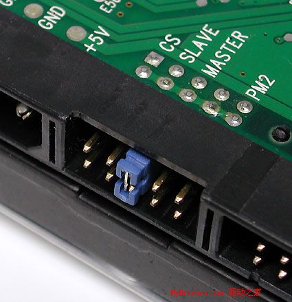 用一条数据线连接两台设备后,需要用下图中的蓝色跳线帽进行主从盘设置,硬盘上一般会有图示说明,或浏览硬盘厂商网站。