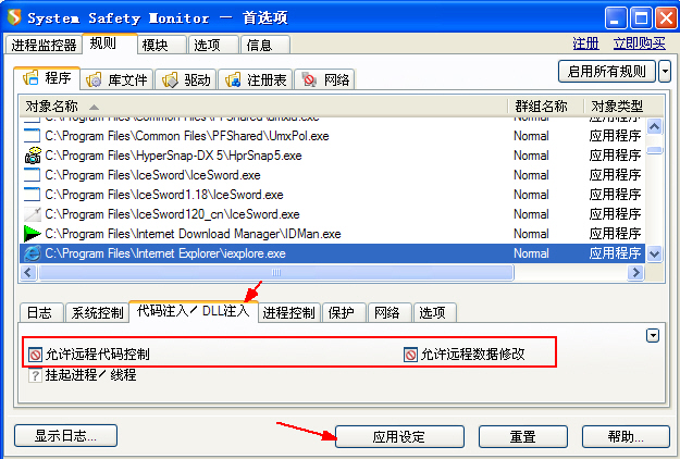请按下图设置一下IE的规则(禁止代码/DLL注入IE进程)
