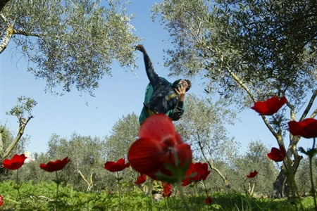 2006年2月24日,在约旦河西岸的一个村庄里,一名巴勒斯人向以色列士兵扔鞋子抗议隔离墙。
