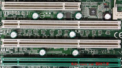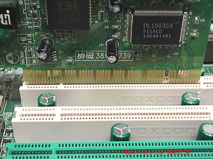 PCI 2.1规范目前支持3.3V电压。插槽左边的分隔能防止老型号5V PCI板卡(图中所示)的错误插入
