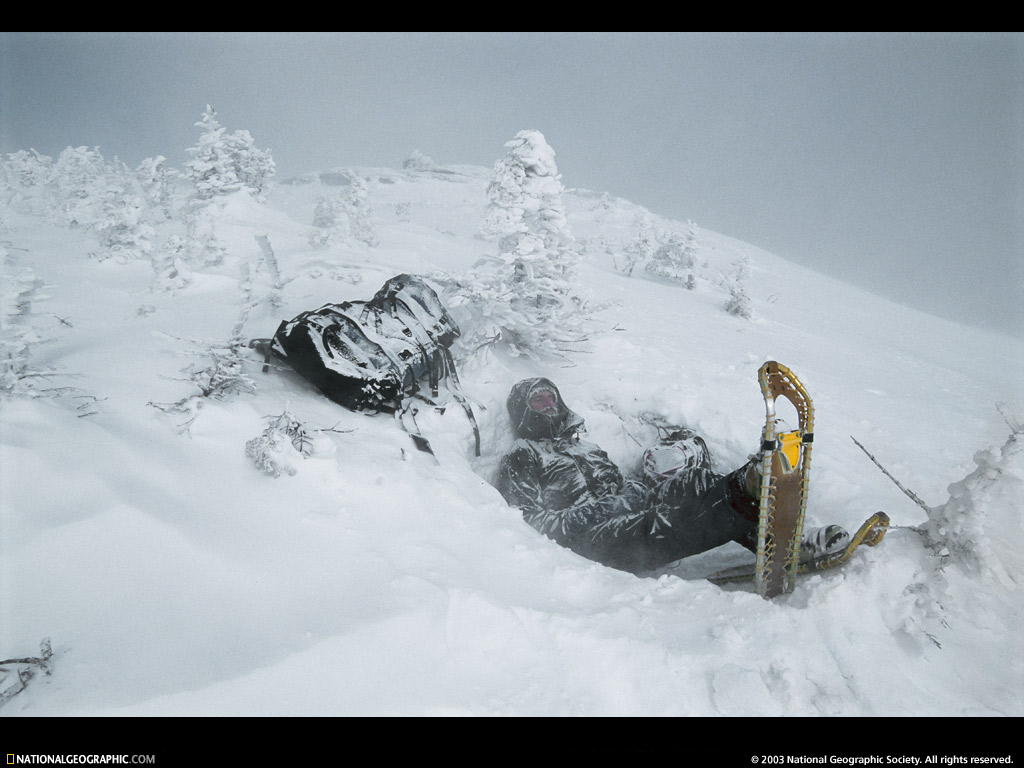 一位穿着雪鞋的阿迪朗达克山区居民停下来休息,在云雾缭绕的Skylight山顶等待美景。