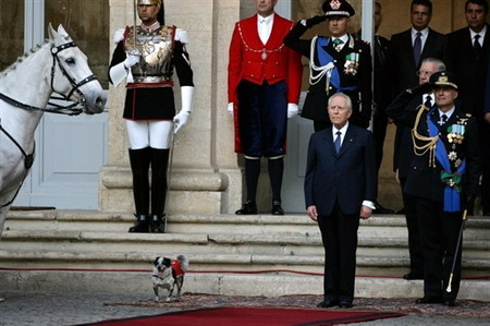 2006年5月15日,意大利前总统钱皮在新总统乔治-纳波利塔诺宣誓就职后离开奎利雷纳宫。