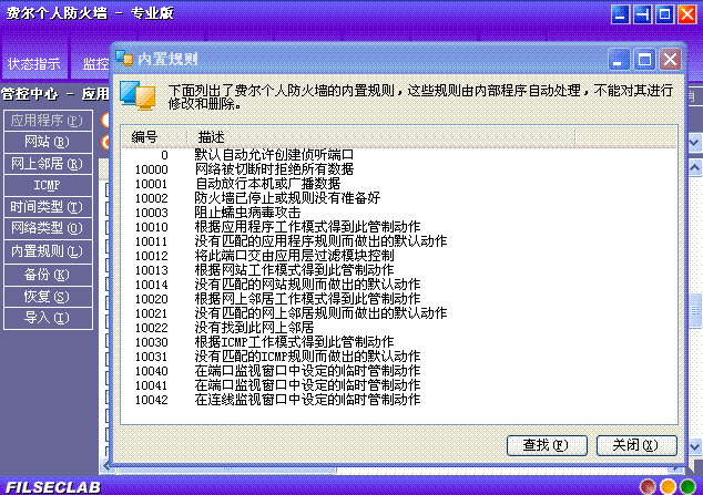 最近大家为sygate验证搞的沸沸扬扬的,多数防火墙必须加入规则包才能通过校验,为什么费尔只有90条默认规则就可以很轻易的不用规则包通过呢?其实没有什么很玄乎的东西,有一个很实用的技术,就是内置规则,里面多数是各种没有匹配的规则而作出的默认动作,这样默认规则没有你也没有设定过一个端口,默认就是拒绝,所以为什么那么多端口都被封闭了就很好解释了,你没有设定我默认就是封闭。很简单就解决了需要内置许多规则才能达到的效果。防火墙厂商是否有可以借鉴的地方呢,我不是说技术,而是思想,简单的方法解决一些问题不是很好吗?