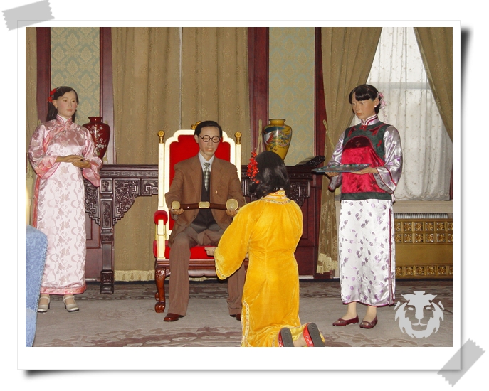 04年11月去长春出差,24小时往返,办完事后匆匆赶去伪皇宫参观...很不错的一个展览馆,装潢很漂亮。溥仪是个悲剧性的人物,那些场景是否是真实的历史再现我不得而知。走廊有灯(灯饰极漂亮),室内却几乎没有照明,游客只能在门口向里眺望,不让用闪光灯拍照,举起相机,显示屏根本是黑的,只好拍到什么是什么。