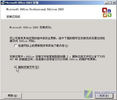 2.Office安装后的文件     在安装完Office 2003时,会有一个“删除安装文件”选项(如图6),我们选中后可以将其在硬盘上的450多MB的缓存文件删除掉。以后要更行Office更新或者添加功能时,只要插入Office 2003安装光盘就行了。     当然,如果你在安装Office 2003时没有选中上述项,也可以手工删除掉硬盘分区上MSOCache文件夹来解决问题。    图6