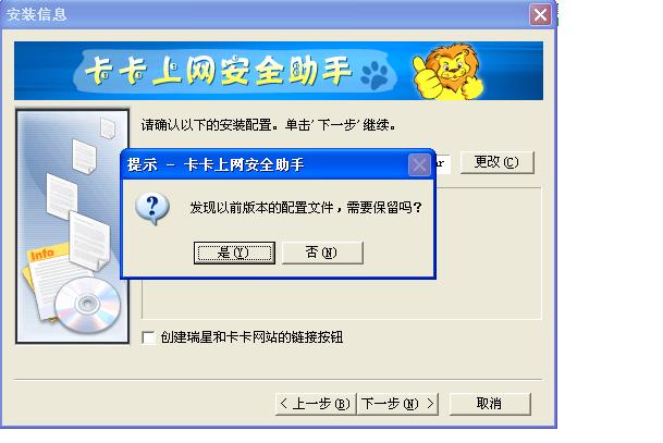 我在升级卡卡安全助手后,打开IE时发现窗口中并没有卡卡安全助手的显示,连查看中工具栏里也没有,我以为升级错误了,然后就从"添加/删除程序"中卸载,再安装.但是并没有我想的那样就好了.在安装过程中还好好的,只是到最后安装时寻问要不要保留以前的文件,不管是选择"是"或者"否"都显示安装失败的窗口.