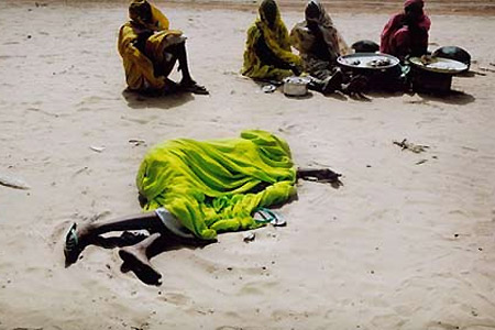 病倒的妇人躺在沙漠中。过路人用衣服罩住她以免她受烈日爆晒。这个妇人在等待救助人员。