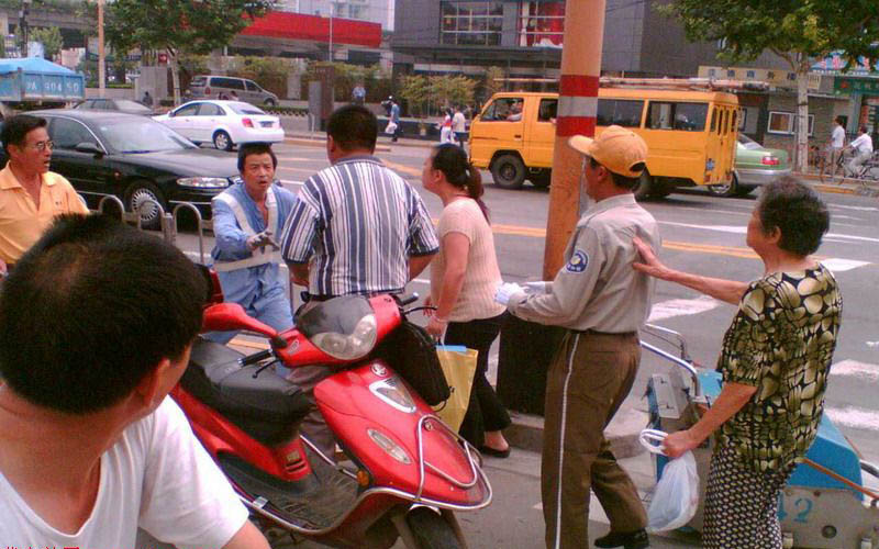 地点:上海曹杨路轻轨站路边 男子因环卫工人在打扫挡了他的道,而上前辱骂,并用手掀翻工人的草帽,一旁的协警在劝说