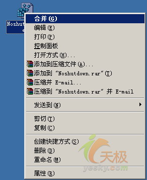 下面打开系统的资源管理器窗口,找到前面保存好的Noshutdown.reg注册表文件,再用鼠标右键单击该文件,从随后弹出的右键菜单中执行“合并”命令(如图1所示),当系统弹出是否要将该文件内容合并到系统注册表时,我们只要单击一下“是”按钮,这样一来上面的代码就会被自动导入到系统注册表中;以后当我们再次尝试关闭计算机系统时,系统就不需要我们输入关机原因了。