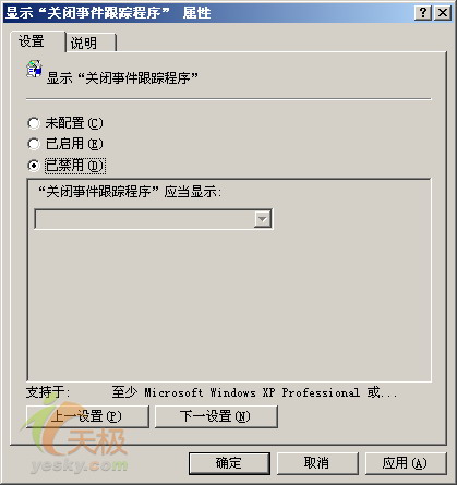 在该界面的左侧窗口区域中,用鼠标依次展开“计算机配置”/“管理模板”/“系统”文件夹选项,并在对应该选项的右侧窗口区域中双击“显示关闭事件跟踪程序”项目,在弹出的如图2所示的属性设置窗口中,选择“已禁用”选项,最后单击“确定”按钮就能使设置生效了。