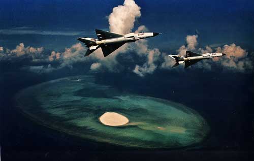 《西沙巡航》摄于1992年5月16日。当时,正受命宣传海军航空兵40年业绩的作者,几经努力申请到一架残击教练机,随残8II编队出征。未经任何飞行训练的作者,身体被固定在狭窄的机舱中,随战机一起跟踪拍摄编队大幅度的战术飞行。作者乘坐的老式喷气歼击教练机机动性能差,油量有限,到达西沙上空只能在低空飞行两三分钟。庆幸的是,为作者架机的海军王牌飞行员王文元上校,在编队大坡度转向七连屿的瞬间恰到好处的抢占了有利的拍摄角度,作者忍受了强大的空气压力和晕机反应,按动了连拍快门,相机以1/500秒的速度,把战机的飞行姿态和西沙最具代表性的地貌环境演于一体,让国产先进战机首航西沙的历史瞬间永远凝固。突然,油量先急!飞机徒然拉起急转返航。一阵强烈的晕眩,作者昏倒在剧烈跃升的机舱中……。这幅浓缩着“保卫南海主权”重要内涵的记实照片,曾获各种摄影奖27项。