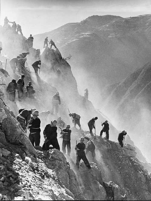 历史上甘肃省以干旱闻名,据记载从汉代到建国前为止的两千一百余年间,共发生旱灾252次。1929年甘肃发生的一大旱灾,夺去了三百万人的生命。千万年来,当地人民渴望改变干旱贫穷的面貌。1958年,在大跃进的背景下,甘肃省党和政府提出一个彻底改变甘肃中部和东部地区干旱面貌的宏伟计划,在崇山峻岭上修建一条山上运河,把洮河水引上山。建成后不仅可以灌溉1500万到2000万亩农田,还可以行船发电,这正是饱受干旱之苦的甘肃人民梦寐以求的事,受到了有全省人民的拥护和支持,十几万农民开赴工地,以气吞山河的气概,打响了一场改造自然的战斗。1958年12月我奉派前往引洮工地采访。九甸峡名不虚传,洮河两岸高山夹峙,民工们在高数百米的悬崖上,用极简单的工具打眼放炮,劈山筑渠。典型的环境突出了工程的艰巨,虽然画面上出现的人并不多,但施工扬起的尘雾,增加了现场的气氮,给人以千军万马的感觉 引洮上山这一改造自然的宏伟工程,由于决策者的冒进,超越了现实的可能性,最终被迫下马,但广大农民兄弟为改变贫穷落后面貌,所迸发的社会主义建设的积极性,则是可歌可泣的。1959年10月这幅作品曾分别在国际影展上获金牌奖和一等奖。