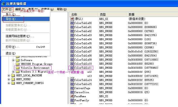 备份:找到我们要备份的“项、值或数据”后,选择它然后再选择"文件——导出"选择存放路径,点确认。