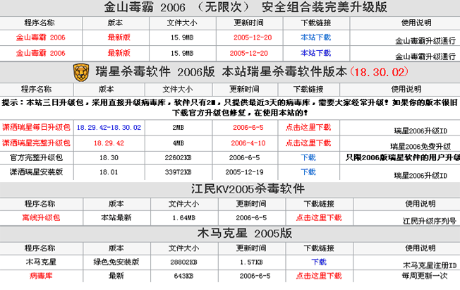 本人共享一网站可以和瑞星正版同时发布新版本的病毒库,还有木马克星病毒库 江民离线升级包 金山毒霸 2006 无限升级版下载,提供每周升级包!