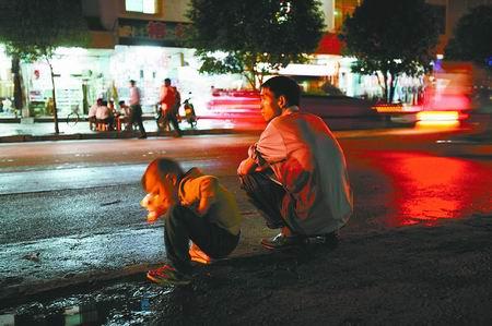 晚上,父亲带着孩子蹲在马路边,旅馆让给妻子卖淫用,要到后半夜两点以后才能回到住处。