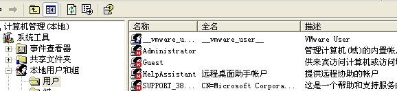 前一段时间下载安装了虚拟机,今天在查看系统时,在C:\Documents and Settings下发现了一个用户名为‘__vmware_user__’文件夹,继续查找又在计算机管理的用户和组里都有它的踪影[如下图]。当时搞得我一头雾水,最近电脑并没有异常现象发生,不可能发生入侵,后来仔细查看用户名确认是虚拟机创建的。