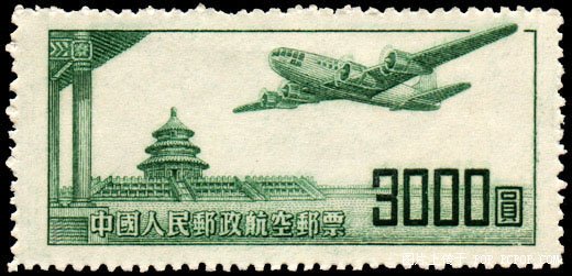新中国成立后,于1951年5月1日发行了第一套中国人民邮政航空邮票。图案是一架飞机从北京天坛上空飞过,票面上印有“航空邮票”字样。要注意,虽然有的纪念邮票或特种邮票上印有飞机图案,但不是航空邮票。如我国发行的“首都国际机场”邮票和“邮政运输”邮票第4枚都是特种邮票而不属航空邮票。