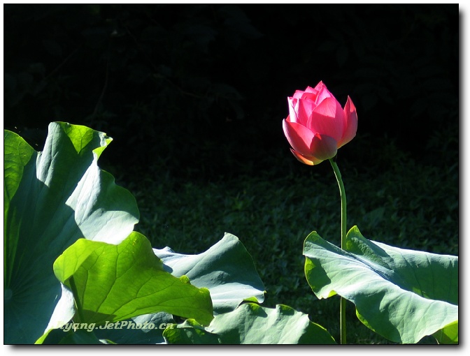 这一丛翠绿荷叶中,真的只此一朵红艳艳的荷花,背后一排树木还有点距离,在强烈阳光下逆光拍摄,背景就黑得比较干净了!
