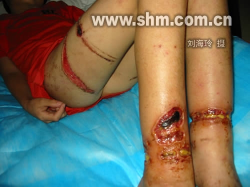 记者见到小伟时,医生正试图从他下体撕下已经腐烂、感染的皮肤。由于伤口已感染至骨头,每撕下一块腐皮,小伟都会发出撕心裂肺般地喊叫……病床上,小伟断断续续讲述了遭父亲虐待经过:10天前,父亲命他趴在地上,将他双手捆在暖气片上,双脚拴在门上,然后再用铁丝束腿,并将铁丝接上高压电……记者看到他浑身上下伤痕累累,旧伤上面还摞着新伤。他的双腿、屁股,到处是泛黑的烂点和淤伤。小伟说这些焦痕是父亲平常「教训」他留下的。泣不成声的小伟母亲告诉记者,夫妻俩在小伟4岁时离婚,因她一直没有固定工作而他父亲抚养费又常常不交,小伟去年开始被迫由他父亲抚养。当天傍晚,小伟突然哭着找到她打工的浴池,这才发现孩子被虐待。浴池的同事匆忙凑了1000元,将小伟送到医院!!
