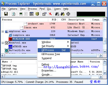 首先运行Procexp,结束WINLOGON进程(kill process),注意下图标,与系统进程不一样。图..(本人小修改..kill process也由本人换成汉化版本)